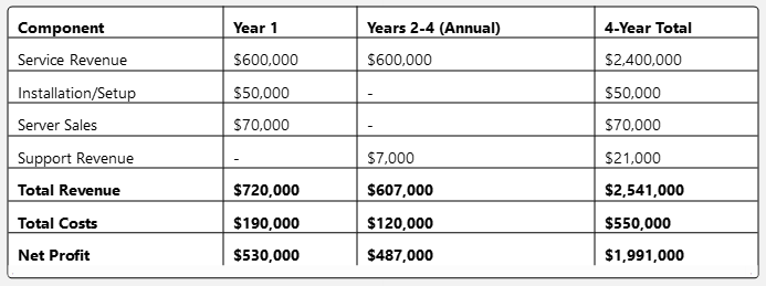 - Server Investment: $70,000 (2 × $35,000 servers with 4-year lifespan)